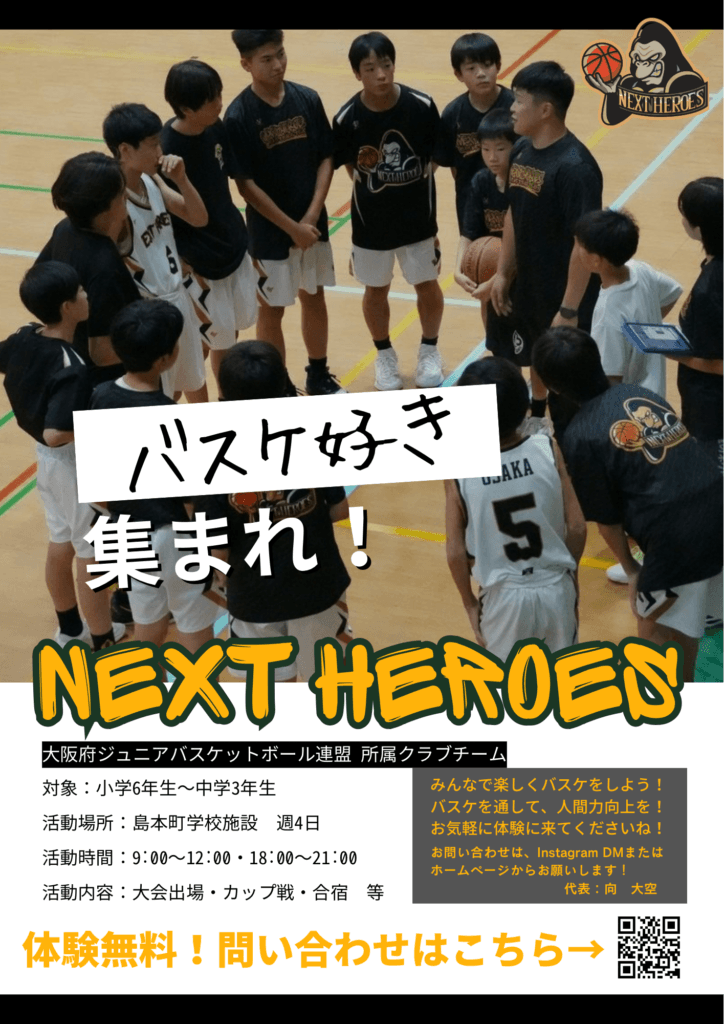 今回は、島本町を拠点に熱く活動するU-15バスケットボールチーム「NEXT HEROES(ネクストヒーローズ)」をご紹介します。